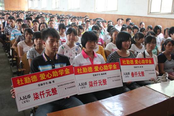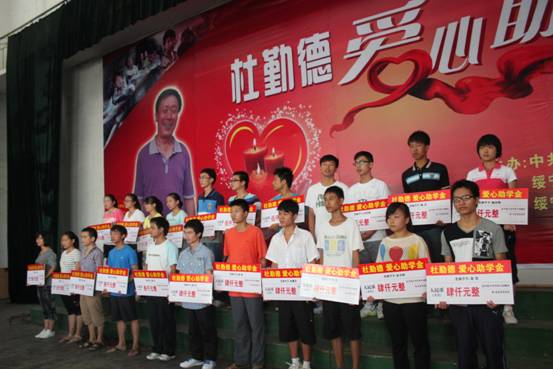 8月28日上午,“杜勤德”助学金发放仪式在绥宁一中学术报告厅举行,仪式由政协副主席、工商联主席张晓霞主持,绥宁籍爱心助学人士、湖南德庆置业有限公司董事长、绥宁县光彩事业促进会副会长杜勤德,县委常委、统战部长、副县长李玉贤,副县长丰新妹,县教育局党委书记吴才录等出席,受助学生和该校高一新生参加了发放仪式。 仪式上,丰新妹副县长宣读了发放文件和受助人员名单及金额,学生怀着感恩之心郑重宣誓:珍惜来之不易的求学机会,刻苦学习,自立自强,早日成才,回报社会。杜勤德与绥宁一中学生亲切互动,交流成功的秘诀,鼓励学生以坚强的毅力、拼搏的精神面对困难,努力学习,回报社会。最后,李玉贤部长讲话,希望受助学生能传承爱心,丰富知识,并表示,县委县政府会关心寒门学子,创造更多的机会,解决学生的实际困难,为绥宁教育发展保驾护航。 杜勤德先生从2007年起每年出资5万元资助绥宁一中50名在校贫困高中生,2010年起,杜先生加大资助力度,每年出资10万元资助绥宁县考上重点本科的贫困大学生。本次共22名学生经绥宁一中和二中调查摸底推选,政府门户网站、主流媒体公示,杜勤德先生确认无异议后,获得了3000至7000元不等的资助。(侯慧)