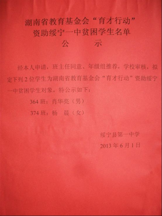 湖南省教育基金会“育才行动”资助贫困学生名单公示