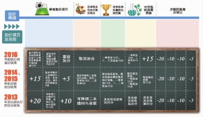 重大国际体育比赛取得个人项目或集体项目(限篮球、排球、足球主力队员,下同)前6名、全国性体育比赛个人或集体项目前6名 省级体育比赛获个人项目前6名、集体项目前3名 具有国家二级(含)以上运动员等级证书 省“三独”(独唱、独奏、独舞)比赛获奖 中学生学科(数、理、化、生物、信息学科)奥林匹克竞赛获得全国决赛 全国青少年科技创新大赛(含全国青少年生物和环境实践活动)、“明天小小科学家”奖励活动、中小学电脑制作活动 国际科学与工程大奖赛,国际环境科研项目奥林匹克竞赛获奖 少数民族聚居州、县、乡的少数民族学生 少数民族聚居地区的汉族学生 散居在汉族地区的农村少数民族学生 散居在汉族地区的城镇少数民族学生 今年高招变化 【新增“农村学生单独招生”】 由教育部批准的具有单独招生资格的本科院校,安排一定的招生名额,自主选拔边远、贫困、民族地区县及县以下中学的农村学生。 【新增“农村学生专项计划”】 由我省省属一本院校实施,招收我省农村户籍学生。 【调整一】 特长生加分调低或者取消,范围包括体育类、艺术类、中学生学科竞赛三类考生。 【调整二】 高中“三独”、艺术特长生不再加分,2016年实施。 【首次明确】 严格规范高校招收高水平运动员,体育赛事级别得到明确。 《湖南省2014年普通高等学校招生工作实施办法》近日发布,根据教育部精神,为拓宽农村学生就读重点高校的升学渠道,今年我省新增“农村学生单独招生”和“农村学生专项计划”。 “农村学生单独招生”是由教育部批准的具有单独招生资格的本科院校,安排一定的招生名额,自主选拔边远、贫困、民族地区县及县以下中学的农村学生;“农村学生专项计划”由我省省属一本院校实施,招收我省农村户籍学生。 1 关键词 农村学生 新增“农村学生单独招生” 和“农村学生专项计划” 今年,高中阶段具有边远、贫困、民族地区县及县以下中学连续三年学籍并实际就读、具有农村户籍且家庭在农村的学生,可报考具有自主招生资格的本科一批高校安排的“农村学生单独招生”计划。具有本省农村户籍的考生,可填报我省省属本科一批高校的“农村学生专项计划”志愿。 举例说明: 湖南大学的此项招生计划是学校本科招生总规模的2%(总规模5000人),采取中学推荐形式,需校长签名、学校盖章,每所中学原则上限推3人。获得资格的考生,高考成绩须达到湖南大学在生源地普通类抛档线下30分(含)以内,也就是比普通考生优惠30分。 重要时间: 6月26日至27日——本科提前批志愿、“农村学生单独招生”、“农村学生专项计划”和“贫困地区定向计划”志愿填报 6月28日至7月2日——其他批次志愿填报。 2 关键词 加分调低 三种类型加分调低或取消 2011年出台的《湖南省部分高考加分项目调整方案》(以下简称《调整方案》),于2014年高考起正式实施。《调整方案》对原加分政策作了较大调整。体育类、艺术类、中学生学科竞赛类三部分考生的高考加分均有下调,部分政策取消或调整。(详见下侧表格) 另:体育类今年还取消了市州级体育比赛加分资格; 调整省级体育比赛获奖考生加分的运动项目,限定为教育部明确的田径、篮球、足球、排球、乒乓球、武术、游泳、羽毛球等8项,取消我省自定的健美操、网球、体操和定向越野等4项。 3 关键词 不再加分 “三独”、艺术特长生不再加分 2013年,湖南在《调整方案》基础上对部分项目作了进一步调整,从2013年秋季高一新生入学开始适用,即2016年高考起开始实施。 取消:参加“三独”比赛获奖加分项目; 调整:少数民族聚居地区的汉族考生、散居在汉族地区的农村或城镇少数民族考生降10分或5分的优惠政策,由过去面向全国高校投档时使用,调整为仅向我省高校投档时使用。 降低分值:降低体育各加分项目5分分值,取消二级(含)以上运动员证书加分。同时,认真规范高校招收高水平运动员。明确高水平运动员各方面的报考条件,通过严格按条件录取和严格执行公示、备案制度等措施,进一步规范高校高水平运动员的招生录取。 4 关键词 体育赛事级别 与高考相关的体育赛事得到明确 按照2013年的进一步调整方案,与高考相关的体育赛事都得到明确: 第一,明确全国性相关赛事。 明确从2014年起,具有加分和报考高水平运动员资格的全国体育赛事,是指由教育部举办或国家体育局举办或两家联合举办的、覆盖全国各省(市、区),且由各省级教育行政管理部门或省级体育行政部门组队参赛的赛事,其下属司局或事业单位,如协会或运动管理中心等举办的运动会不具有此类资格。 第二,重新认定省级相关赛事。 从2013年秋季进入高中一年级学生开始,具有加分和报考高水平运动员资格的省级体育比赛限定为省级综合性运动会(举办省级综合性运动会的具体事宜另行通知),其他省级体育比赛获奖均不具有相关资格。对2012年及以前进入高中阶段学习的学生,具有加分和报考高水平运动员资格的省级体育赛事为:省教育厅、省体育局各自举办或者两家联合举办的体育赛事;对于省教育厅和省体育局一年内举办的相同赛事或相同项目,只分别各认定一次。加分项目限定为田径、篮球、足球、排球、乒乓球、羽毛球、武术、游泳等八项,其中集体项目仅限于篮球、足球、排球三项。 第三,建立赛事备案制