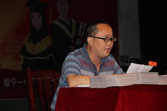 6月4日上午,我校2014届高三毕业典礼暨高考动员会在大礼堂隆重举行,校长唐立新、党总支书记肖华平、副校长贺占宏、教务处主任袁仕进、高三年级全体班主任及900余名毕业生参加了本次大会,典礼由肖华平书记主持,县委助理调研员潘绘军应邀参加并讲话。 会上,潘绘军以亲身经历鼓励学生保持良好的心态,释放压力,存感恩之心, 并祝愿全体毕业生在高考中取得优异成绩。贺占宏副校长宣读毕业致词,与全体同学一起回顾高中生活的点点滴滴,勉励大家要立志、报国,随后,各班班长从校领导手中接过汇集了三年心血和努力的毕业证书,礼堂中响起如雷般的掌声。唐立新校长对同学们圆满完成学业表示热烈的祝贺,希望大家以饱满的热情迎接高考,以严谨的态度对待高考,牢记母校“厚德博学、知行合一”的校训,并承诺学校将尽全力做好服务工作,确保同学们有动力、无压力,轻松应考。最后袁仕进主任详细解读了参考程序、注意事项、应对措施,并就学生在考前两天及考试期间的身体、心理、学习、休息、考试环节及诚信考试等方面做了详细的强调和要求。