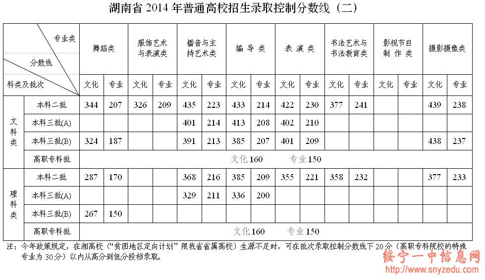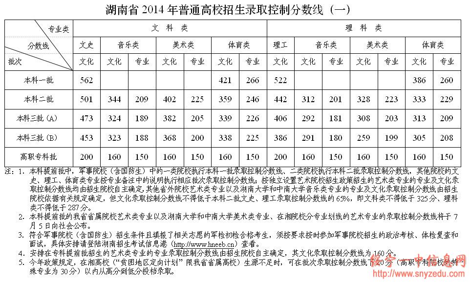 今天上午,湖南省教育考试院正式公布2014年湖南高考各批次录取控制分数线,其中文史类一本为562分(去年557分),二本为501分,三本为473分(A)、453分(B),专科一批线200分;理工类一本为522分(去年495分),二本为442分,三本为406分(A)、386分(B),专科一批线200分。