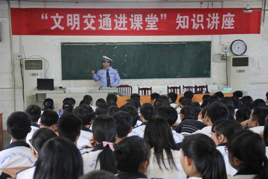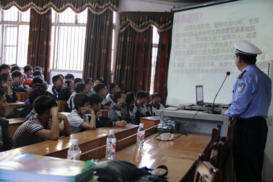 我校为了认真贯彻落实县教育局关于创建省级卫生县城、市级文明县城实施方案的文件精神,积极推动创建省级卫生县城、市级文明县城工作的开展,按照学校“创建省级卫生县城、市级文明县城实施方案”布署,于10月22日邀请县交警队来校开展主题为“文明交通进课堂”的知识讲座。交警大队杨继军通过形象生动的语言、图文并茂的交通警示案例等向学生讲解交通知识,帮助学生养成良好守法观念和安全出行意识。民警还向学生发放了“中小学生交通安全知识”、“中学生乘车知识”、“给家长的一封信”和“交通安全三字经”、《交通意外事故的预防》等宣传资料,同时要求全体学生和家长一起学习交通安全知识,争做守法、文明、安全出行的好学生。