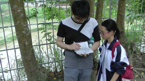 学生在曲幽谷和周益平老师讨论曲幽谷生态环境的保护