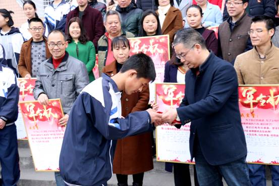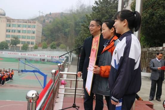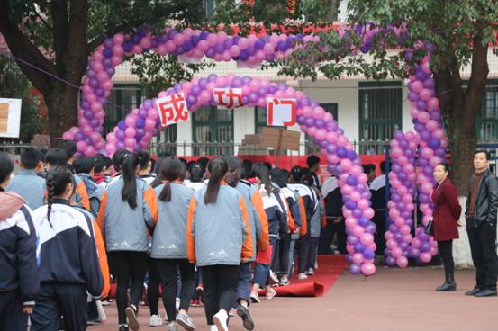 罗局长发言后,家长代表为高三学生赠送“方法、效率、成功”画卷,吴才录副局长授“马到成功大旗”,各班班长递交军令状,高三学生、教师宣誓,最后,全体高三学生领取唐立新校长派发的红包,在与会人员殷切的期待中走过成功门,誓师大会圆满结束。
