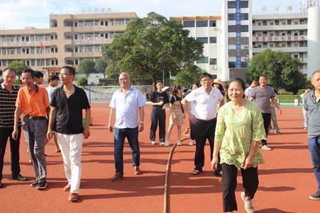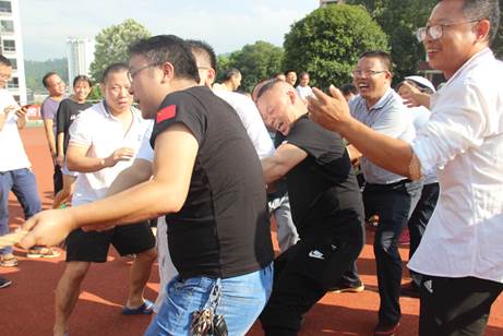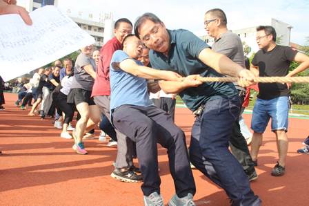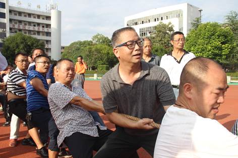 全体教工在运动场参加拔河比赛。教师分为高一年级组、高二年级组、高三年级组、行政教辅组,每组选派男队员14名,女队员6名参赛。赛场上,裁判员严谨司令。大家齐心协力,呐喊生威,这一刻,后退,就是胜利。上场的队员全力以赴,啦啦队员倾力助威,师生一起演绎力量和技巧的竞技。虽然运动员手掌红肿、双腿发软,啦啦队员声音嘶哑、咽喉疼痛,但大家脸上的笑颜是最美的风景。经过激烈的角逐,高一年级组夺冠。胜也罢,败也罢,每个人都心情愉悦。通过比赛,大家释放工作压力,蓄电开启新征程。