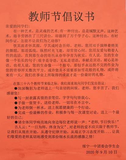 9月10日,我校组织开展一系列教师节庆祝活动。 按照县教育局统一部署,开展评选县优秀校长、优秀班主任、县名师活动。 团委倡议全体同学心存感恩,尊师重教。