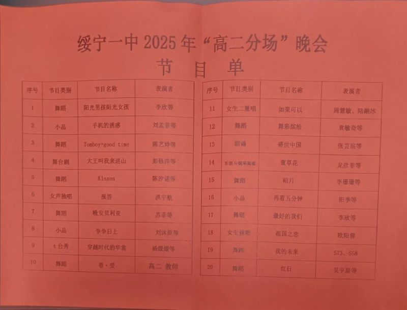 星光熠熠,梦想飞扬 绥宁一中第十三届校园文化艺术节之高二分场晚会 来源:绥宁一中校园网 更新时间:2024-12-24 阅读:10607次 |