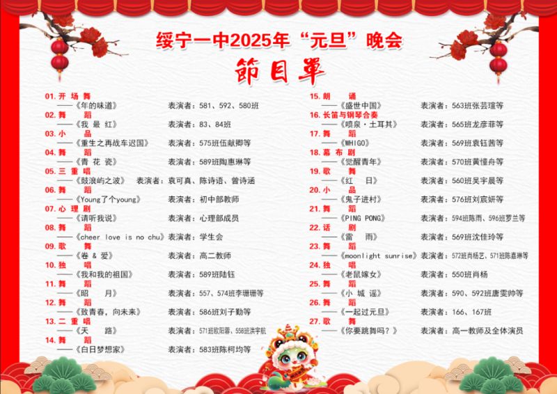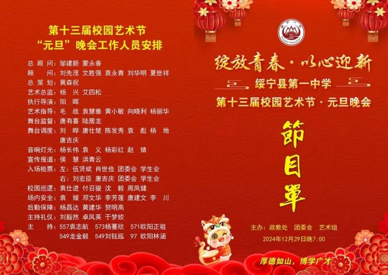 绽放青春.以心迎新 2025年绥宁一中元旦文艺汇演精彩纷呈 来源:绥宁一中校园网 更新时间:2025-1-1 阅读:11906次 |