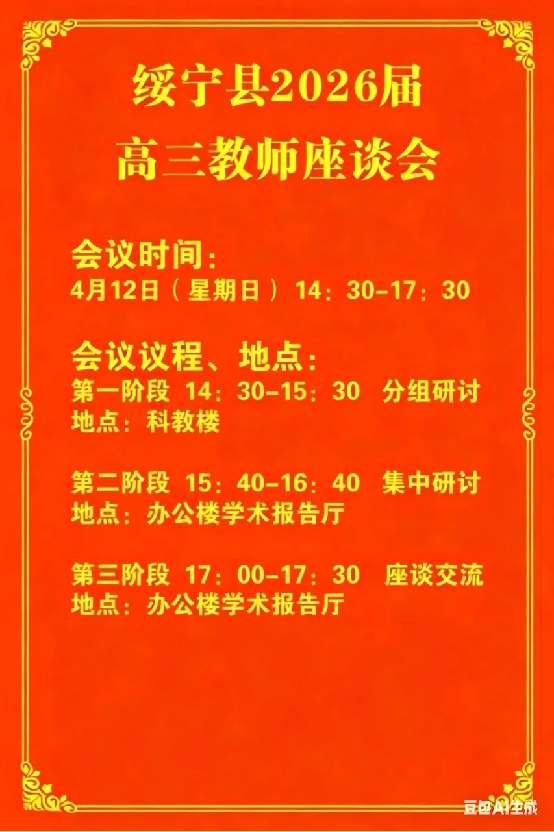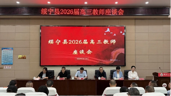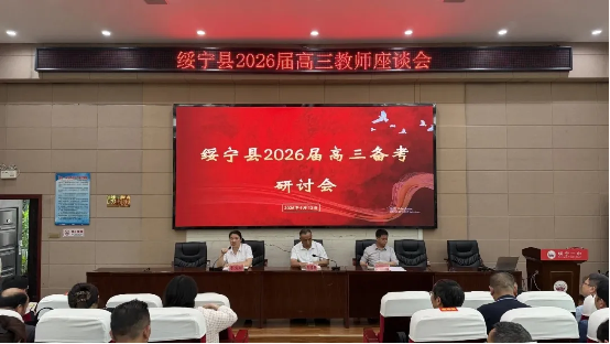 为精准把握2026年高考命题趋势,优化二轮复习策略,推动县域高考备考资源共享、优势互补与质量提升,4月12日,绥宁县2026届高三教师备考交流活动在绥宁县第一中学顺利举行。县委书记吴军臣出席活动,县领导石亮明、梁恩雄、唐艳、陈竞帆、伍丹丹参加,县教育局党组成员、绥宁一中、绥宁二中、县职业中专、育英中学全体高三教师齐聚一堂,共话备考良策,凝聚奋进合力。 活动设置座谈交流、分科研讨、集中研讨三大核心环节,层层递进破解备考难题。 01座谈交流 · 共话冲刺