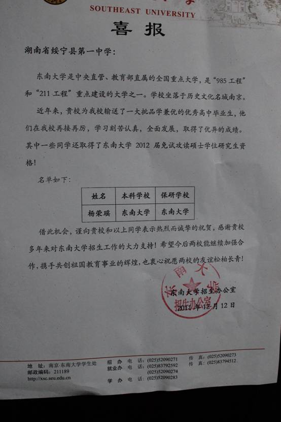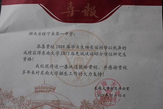 我校杨荣瑶同学在东南大学就读期间学习刻苦,成绩优异,取得了东南大学2012届免试攻读硕士学位研究生资格。