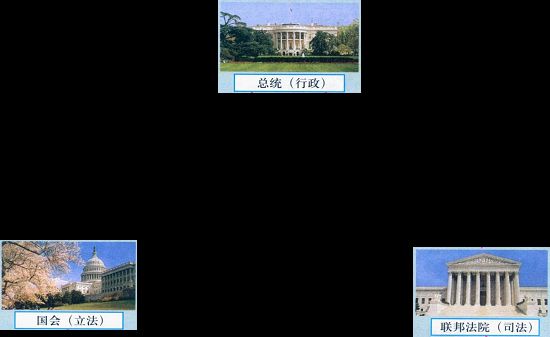 但美国的立法权、行政权、司法权之间制约达到平衡,体现三权分立原则。总统和国会之间、国会本身两院之间、司法与其它部门之间均构成制衡。