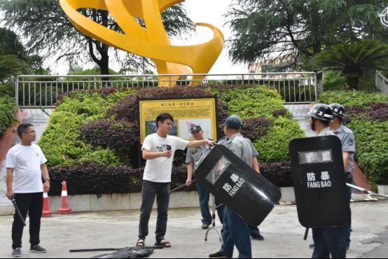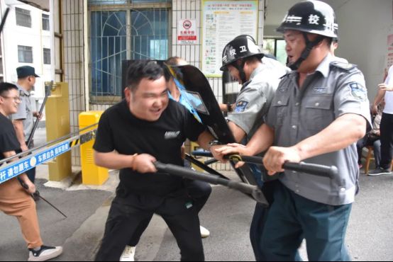 政教处副主任毛战随后对防暴盾牌、钢叉、警棍等器械的使用方法进行现场演示与培训,确保全体人员熟练掌握应急技能。 02实战演练 快速响应