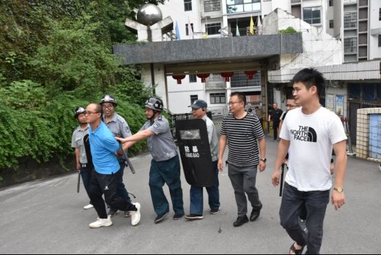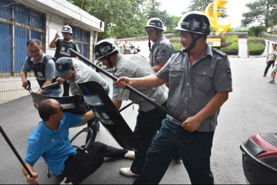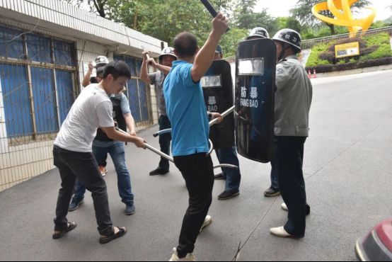 应急小组与保安人员协同作战,利用盾牌、钢叉等器械形成包围圈,仅用时3分钟便将“暴徒”制服并带离现场。