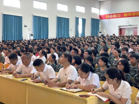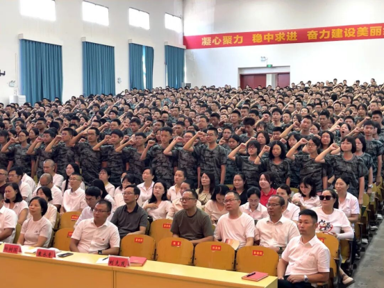 8时15分,高一新生身着整齐的军训服有序步入主会场,高二、高三及初中部师生在各班教室通过现场直播收看并参与开学典礼各项议程。 8时30分,开学典礼在庄严的升旗仪式中拉开帷幕。当鲜艳的五星红旗冉冉升起,全体师生庄严肃立,奏唱国歌,激昂的旋律激荡着每个人心中的爱国情怀。 02思政课堂 铸魂育人