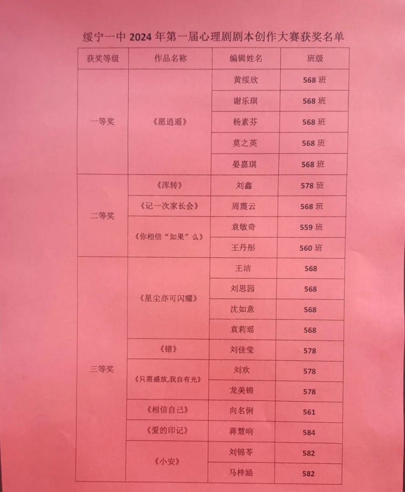 政教处黄森祝主任宣布“绥宁一中 2024年第一届心理剧剧本创作大赛获奖名单”