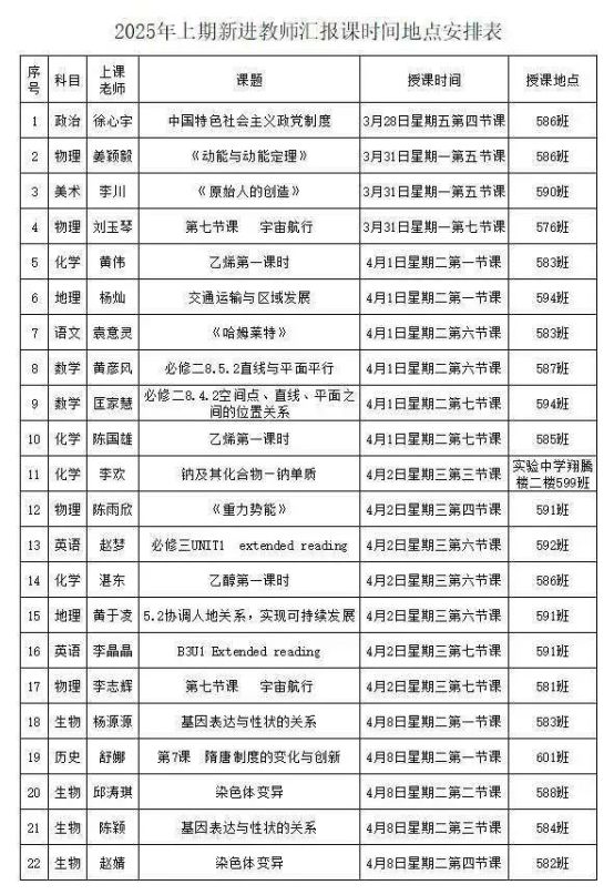 为提升新进教师专业素养,夯实教育教学基本功,绥宁一中于3月28日至4月10日组织开展了新教师汇报课活动。语文、数学、英语、历史、地理、政治、物理、化学、生物及美术等学科的27位青年教师登台授课。 01课堂展风采,教学显匠心 青年教师们立足学科核心素养,精心设计教学环节,灵活运用多媒体技术,通过情境导入、任务驱动、小组合作等方式激发学生潜能。语文课堂以诗意的语言解读文本内涵,数学课借助生活案例演绎抽象公式,历史课以时空轴线串联文明脉络,美术课则通过创意实践引导学生感受艺术之美……多样化的课堂呈现了青年教师扎实的专业功底与创新意识。