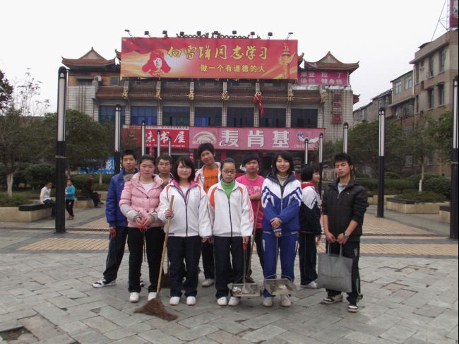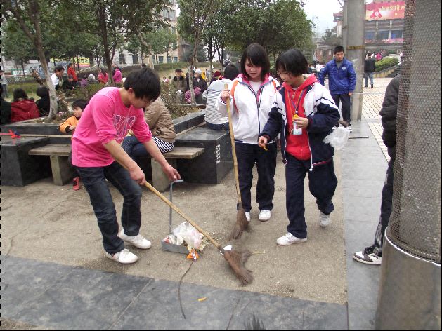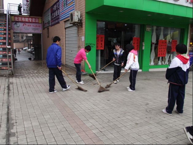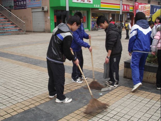 近日,350班同学在雷锋精神的影响下,响应学校领导、老师的号召,相约来到县城街头打扫卫生。同学们不怕苦、不怕累、不怕脏,对一条条街道,一个个死角进行了认真的清扫。既推介了雷锋精神,又净化了生活环境,陶冶了个人情志,赢的了人们的好评。图为同学们在街头打扫卫生。