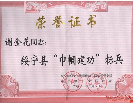 谢金花老师获2011年绥宁县“巾帼建功”标兵荣誉称号 来源:绥宁一中校园网 作者:龙景忠 更新时间:2011-3-11 阅读:39797次 |