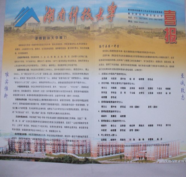 湖南科技大学送来喜报:近四年来,我校毕业就读于湖南科技大学学生,学习刻苦,成绩优异,素质全面,表现突出,获得了许多荣誉,是同学中的优秀楷模。(6人光荣加入中国共产党、15人担任学校、学院主要学生干部、5人获得国家级奖励、3人获省级奖励、12人获校级奖励、7人考上研究生。)