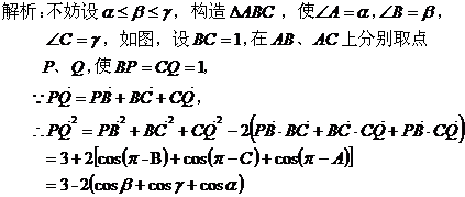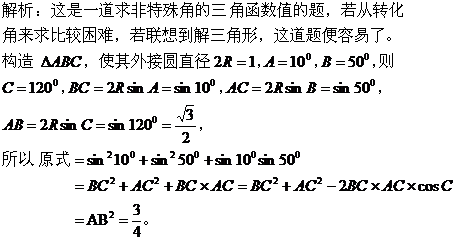 于真灵 三角问题包括三角公式、三角函数、解三角形等内容,是高考中重要考试内容之一,在解答三角问题中,运用的公式多、运算过程较繁锁、使用的方法多,但有些三角问题,如能从其所给条件中抓住其本质特征,构造数学模型,其解答过程就变得简单、快捷、准确。应用好构造思想解题的关键有二:一是要有明确的方向,即为了什么目的而构造;二是弄清条件的本质特点,以便重新进行逻辑组合。下面举例说明构造数学模型巧解三角问题。 1、构造平几模型