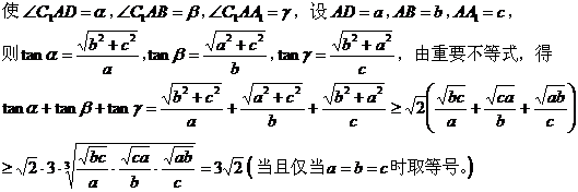 解析:由于长方体一条对角线和它过同一个顶点的 三条棱所成角在余弦值的平方和为1,为此可 构造一个长方体
