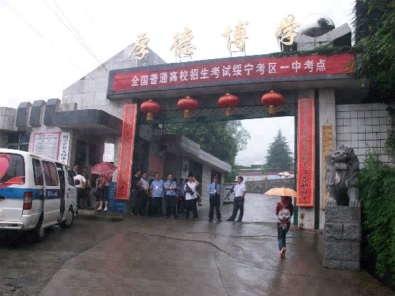 6月7日,绥宁县公安局副局长肖冰、交警大队副大队长向先国带领公安人员、交警大队人员等一大早就驾车来到绥宁一中考点,他们冒着大雨一边在公路上帮助保卫指挥护送考生车辆,一边叮嘱驾驶员一定要慢走缓行、注意安全,还不时检查车辆的安全状况,同时在校门口维护出进校门人员、车辆的秩序。 据我所知,从十多年来,绥宁县公安局、县交警大队,他们对一中的高考考点维护交通秩序等安全保卫工作从未中断。今年更加强了和一中的联系,指定副局长和交警大队副大队长等一起维扩一中的安全保卫和交通秩序,并逐辆检查送考车辆,确保无安全隐患,保证了高考参考师生的安全,受到一中全体师生的一致好评。