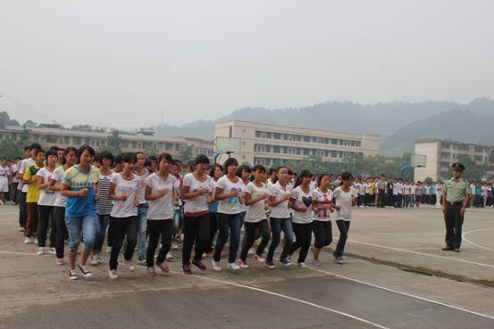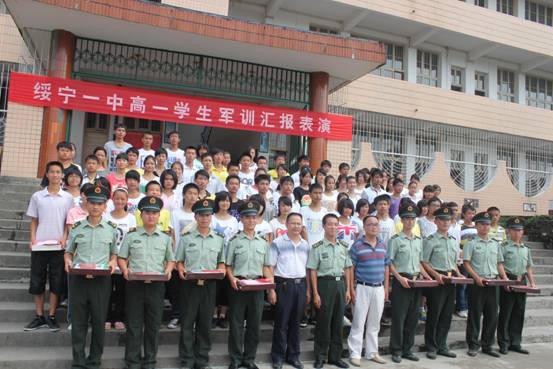 8月30日上午,绥宁一中2012级高一新生军训会操表演在学校操场隆重举行。学校及部队领导出席并参观了本次军训会操表演。 汇报表演按抽签顺序进行。各班同学以饱满的精神状态、严整的军容和整齐的步伐精神抖擞地接受检阅。表演内容包括立正、稍息、跨立、停止间转法与齐步、跑步等,评委从入场、会操质量、人数和服装、领队、精神面貌、退场六个方面进行打分,经过激烈角逐,389班荣获会操表演一等奖,375班、379班荣获二等奖,376班等五个班级荣获三等奖,79名同学被授予“优秀学员”荣誉称号。 会操表演结束后,绥宁一中副校长贺占宏向在军训中付出辛勤劳动和汗水的教官、老师们表示了衷心的感谢,并对新生们在10天军训中取得的优异成绩给予了充分肯定,希望同学们在即将开始的高中生活中,刻苦学习,发奋图强,将军人的优良作风保持发扬,成为对社会有用之才。