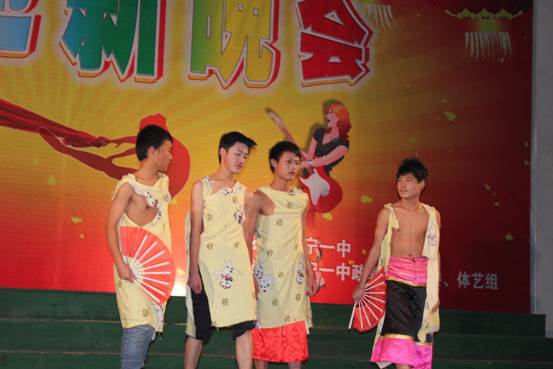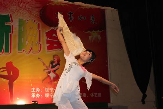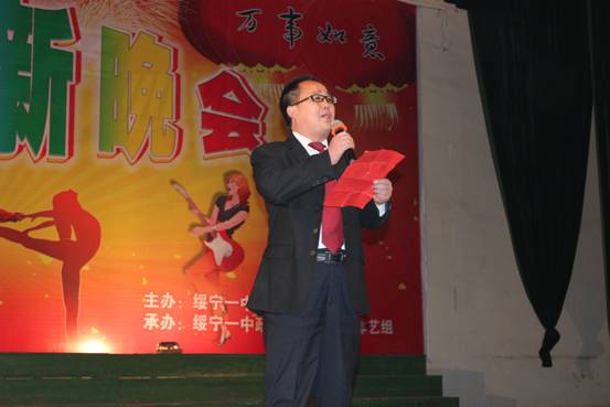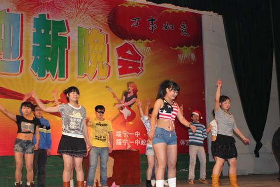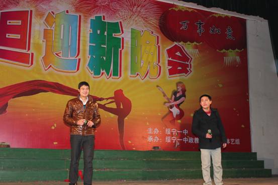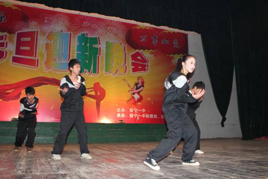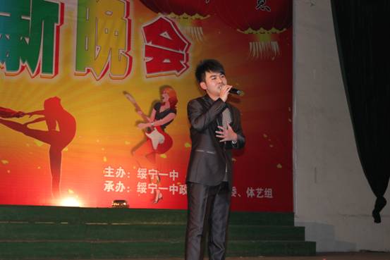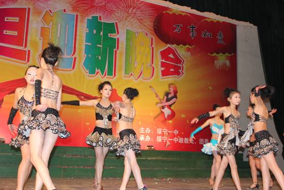 2012年12月29日、30日晚,绥宁县第一中学2013年元旦迎新晚会在学校报告厅拉开帷幕。 本次汇演活动一改往年只进行一个晚上的惯例,分高一主场和高二主场两个晚上进行,以便给更多有准备的文艺爱好者以锻炼和展示才华的平台。 一年一度的迎元旦文艺汇演是该校一项传统的文艺汇演活动,由政教处、体艺组、团委会联合主办,每年的汇演活动都得到了学校领导和各处室的大力支持以及班主任老师、音乐舞蹈舞蹈教师的鼎力协助。各班精心排练后进行选拨后参加演出,音乐、舞蹈特长生、街舞社团也为晚会增添了美丽的亮点,主持、舞台、灯光、音响、服装、布景、道具等都经过精心准备,力求完美。 本次晚会学校行政领导和年级组也准备了精彩的节目与学生同乐。通过活动,既拉近了师生的距离,又丰富了学生的课余文化生活,营造了和谐的校园文化氛围。