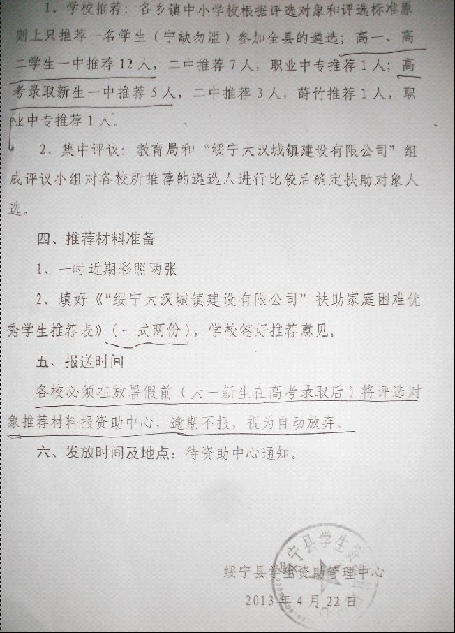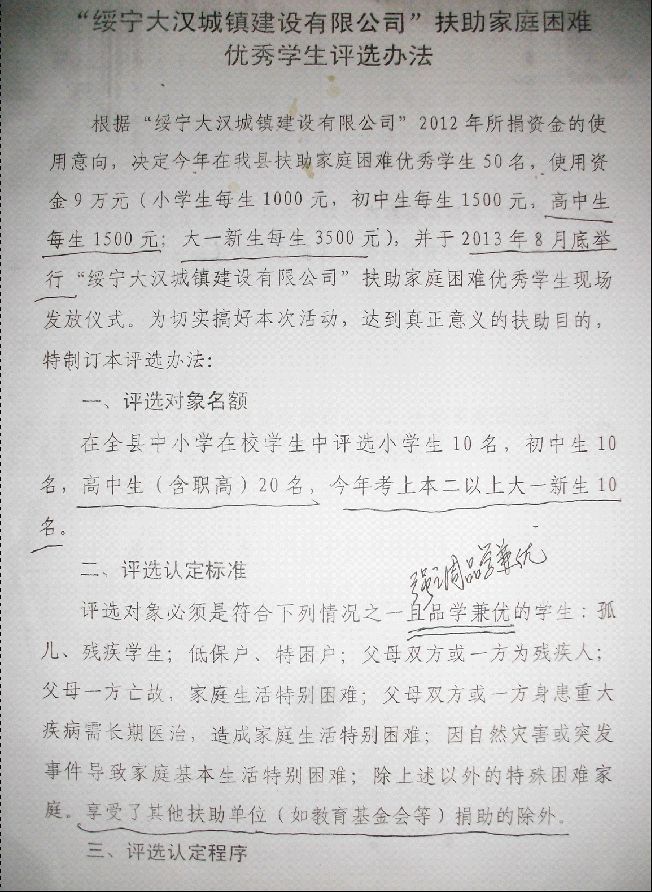 “绥宁大汉城镇建设有限公司”扶助家庭困验优秀学生评选办法公示