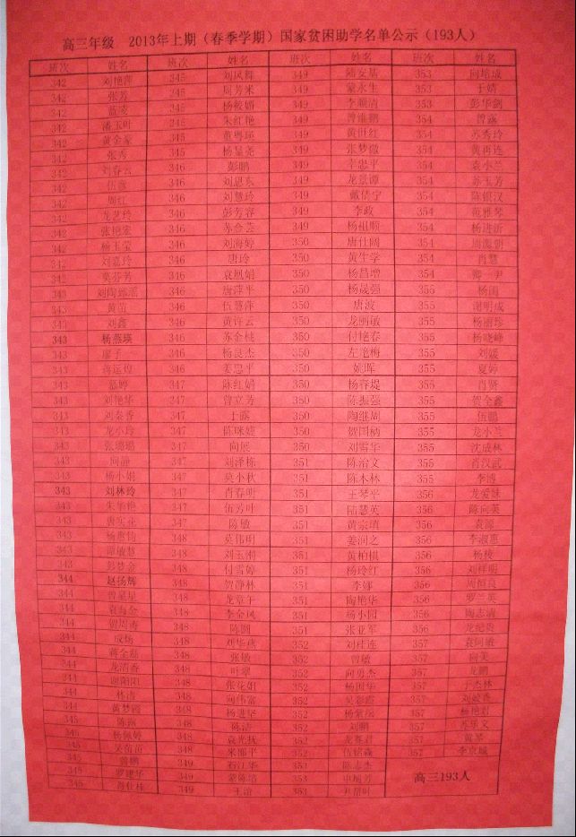 2013年上期(春季学期)国家贫困助学金资助名单公示 (高三)
