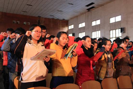 “纵然路有荆棘,途有坎坷,我们也会勇往直前;即便太行雪拥,蜀道连连,我们也会直挂云帆。生命如虹,青春无悔;百日拼搏,志在必得”。2月25日下午,我校高三百日誓师活动在报告厅隆重举行。铿锵有力的誓言让人心潮澎湃,热血沸腾。 会议由贺占宏副校长主持,对第4次联考中取得优异成绩的同学进行了表彰和奖励。陈敏荣和陶依婷同学代表高三学生表达了她们珍惜百日,备战高考的决心。付立喜老师代表高三教师作表态发言:高三教师必将利用这一百天,超常付出,精心备课,高效授课,团结协作,争创一流。高三年级组长杨世开要求全体师生紧密配合,加强沟通,心存高远,脚踏实地,分秒必争,争取高考的胜利。最后,校长唐立新作总结性发言,希望大家端正态度,用坚定的信心,积极的心态,科学的方法做最后的冲刺,回报父母,无愧人生,并预祝2014届的全体学生在今年的高考中金榜题名、马到成 功。会议结束后,高三师生在红色条幅上签名,有序退场。 最近几年,我校都会举行高三百日誓师活动,通过集体呐喊宣誓的形式,既可以帮助学生宣泄压力、提升激情,同时,学校会严格要求高三教师,明确自身承载的使命和责任,以高度负责的态度和敢于攻坚的意识,全力投入高三教学工作。