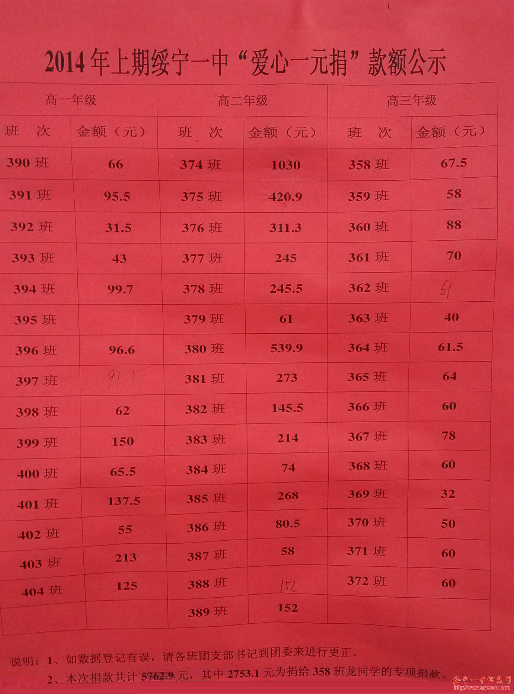 2014年上期绥宁一中“爱心一元捐”款额公示