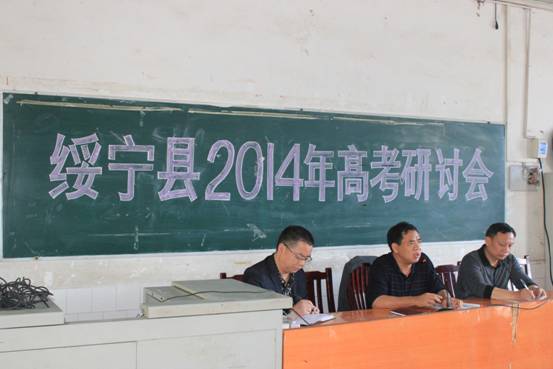 4月12日,我县2014年高考研讨会在一中举行。 县教育局吴才录书记、普教股股长彭富元、副股长肖庆明、招生办主任杨宗照以及绥宁一中、二中、莳竹学校近100余名高三任课教师参加了本次研讨会。 研讨会分教师集中交流和以学科组为单位针对性讨论两个议程。绥宁一中唐立新校长对各兄弟学校同仁的到来致以热烈的欢迎。肖庆明副股长进行了第二次联考成绩分析,建议各学校有针对性的开展后阶段教学,并加强专业生的文化复习和学生的心理辅导。在集中交流阶段,三个学校的相关领导对高三年级的基本情况、主要措施、存在问题和努力方向等进行了汇报。吴才录书记强调:各学校要把握好两个工作重点,一是端正思想认识,做到学校同心同德,教师全心全意,学生全力以赴;二是讲究教学方法,从实际出发,加强高考试题研究,回归教材,并注重学生情绪动态、心理素质、应试技巧等非智力因素的培养和发挥。在分组讨论阶段,各学科任课教师共享各自掌握的高考信息及备考经验,从学科特点、命题走向、阅卷启示、规范答题等方面,对2014年高考试题进行全方位分析。