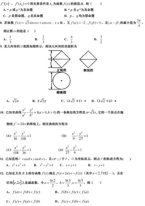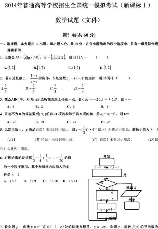 2014年全国高考一模数学试题(文科)(新课标1卷)