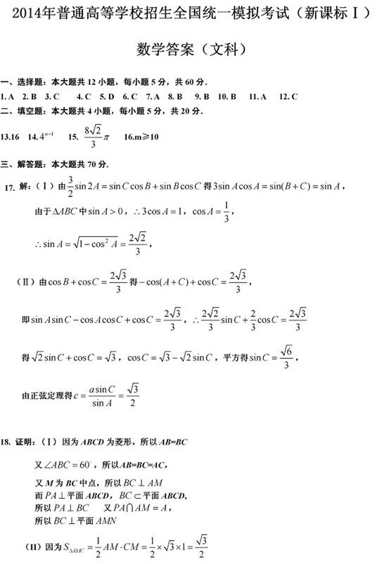 2014年全国高考一模数学试题及答案(文科)(新课标1卷)
