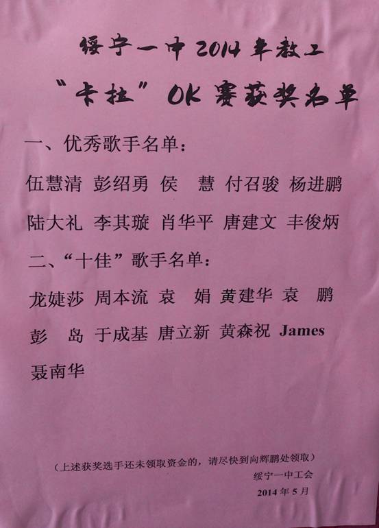 绥宁一中2014年“教工卡拉OK赛”获奖名单