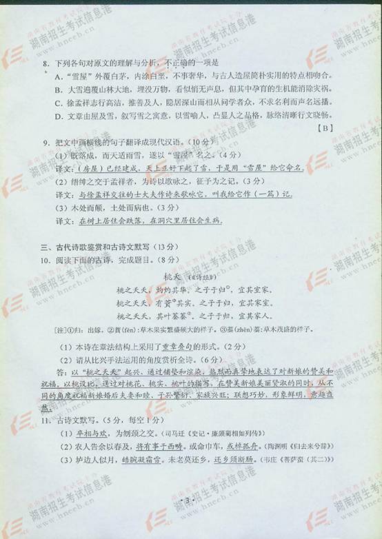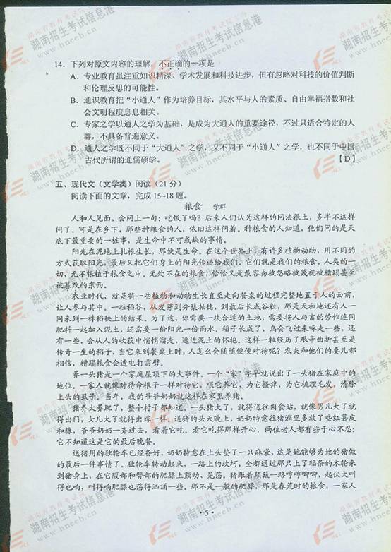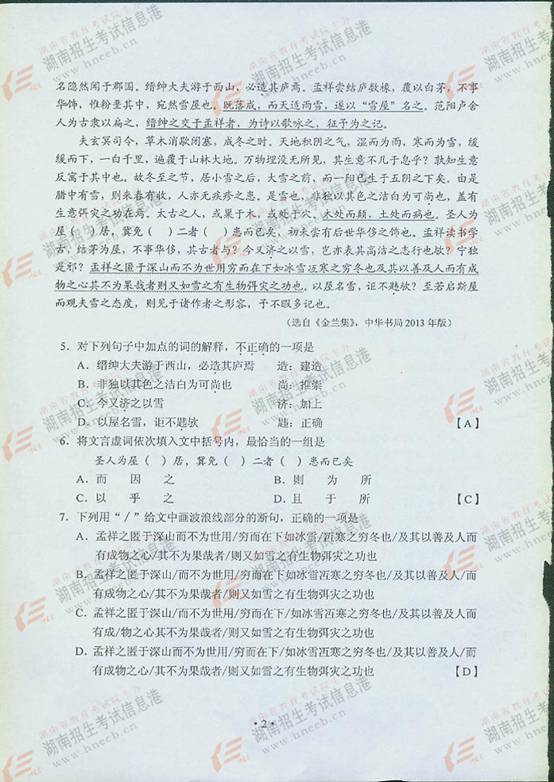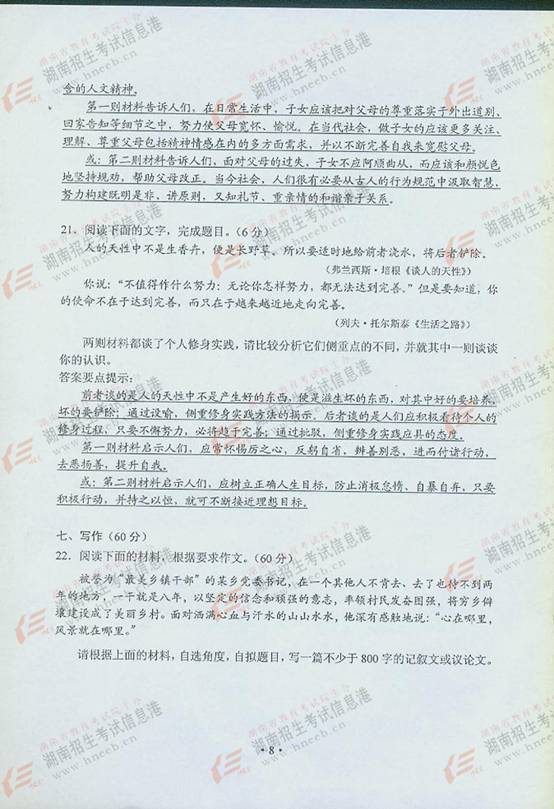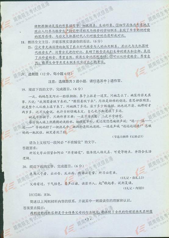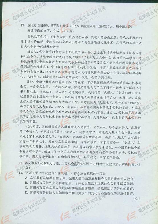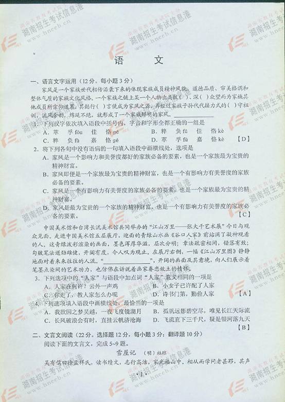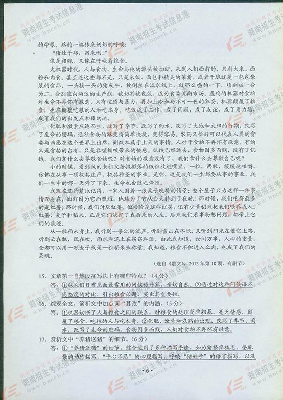 2014年全国普通高校招生统考(湖南)试题参考答案(语文)