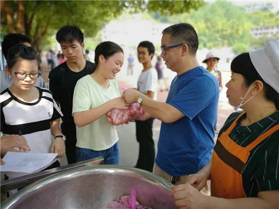 为做好这件看似容易的事情,学校后勤工作人员全力以赴,尽心尽责。 分管后勤工作的陈贵副校长说,学校后勤部门始终遵循学校总体工作思路,做好教育教学服务工作,为师生创设良好的工作学习环境。我校留守孩子比较多,给考生派发鸡蛋,不仅能提高自身的营养状况,考生在高考备考中更具自信,也可以让家长放心,更加安心的工作。