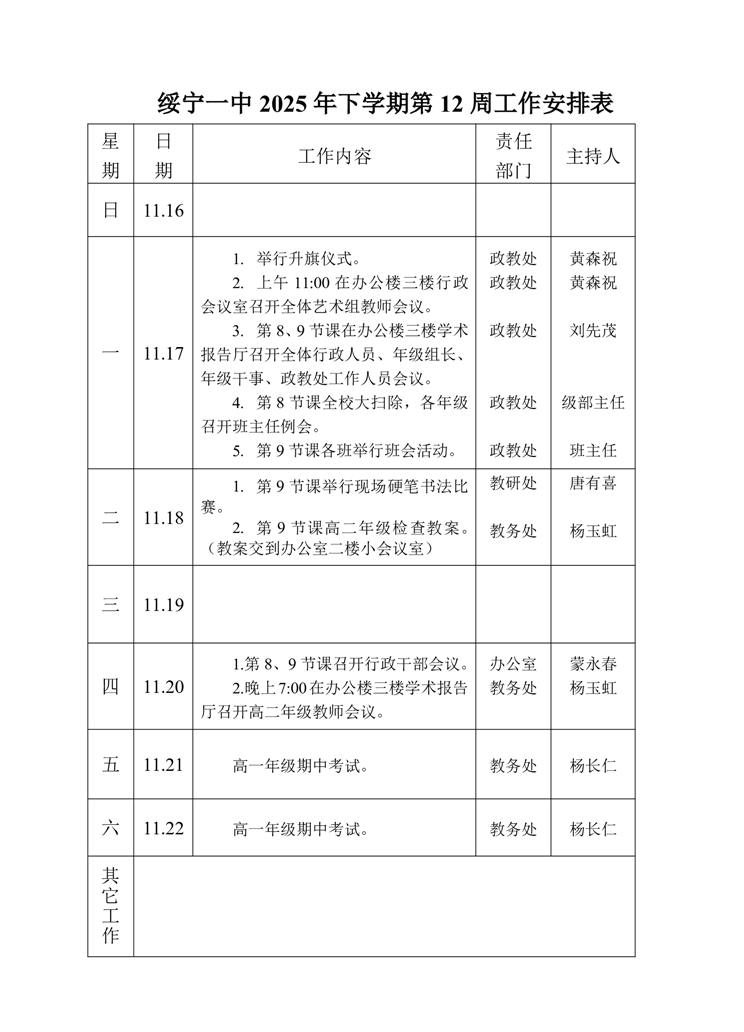 绥宁一中2025年下学期第12周工作安排表