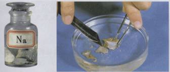 [学生描述]反应程度 、火焰颜色、生成物状态并记录。 [板书]1、与氧气反应: 4Na+O2=2Na2O 2Na+O2 [投影]潜水艇图片,思考:潜水员如何获得氧气呼吸?