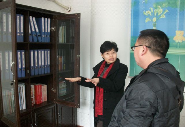 心理教育中心主任郭玉良老师向贺占宏副校长介绍他们学校心理健康教育、心理辅导情况。